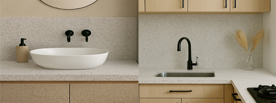 • Commercial: 1800mm×2400mm large slabs for hotel walls, colorful particles for mall check-in spots, fine-grain for office receptions.